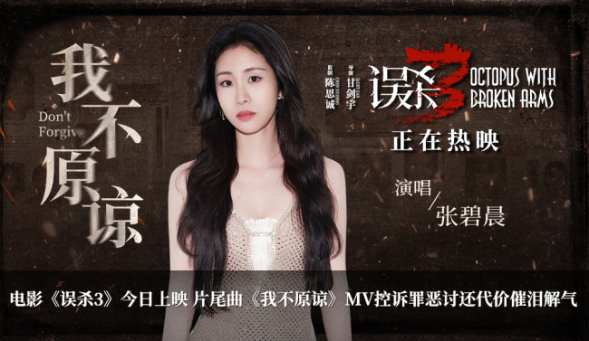 犯罪悬疑电影《误杀3》今日正式上映,全新发布的片尾曲《我不原谅》MV由唐恬作词,彭飞作曲,张碧晨演唱,不仅细腻传达了父母对孩子的爱,同时也铿锵有力地唱出了父母对人贩子的恨,那一句句坚定的“我不原谅”背后,藏着太多的痛苦和绝望,以及将被夺走的所有全都讨还的执着,情感力量振聋发聩,带来深深共鸣与感动。电影《误杀3》由陈思诚编剧/监制,甘剑宇执导,肖央、佟丽娅、段奕宏、刘雅瑟领衔主演,王龙正、冯兵、周楚濋、徐诣帆主演,高捷、尹子维特别出演,张榕容、卢慧敏友情出演。影片正在热映中,解压解气爽爆开年。