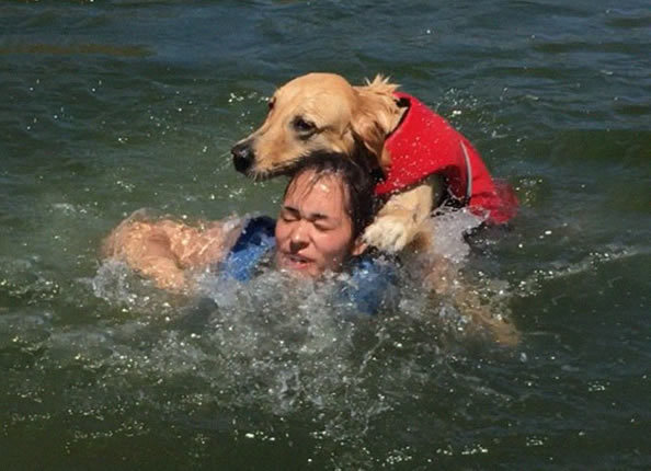 原来这是他两岁的爱犬第一次在水中游泳,因为水很深,主人还特地给狗狗穿了狗狗救生衣。 主人的妹妹随后也下水游泳,没想到狗狗在看到妹妹后,竟然把整个身体压在她身上,妹妹整整5秒钟都被按在水里,差点无法上岸。