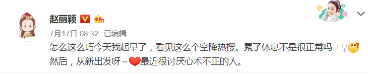 可能真是人红是非多,早前赵丽颖因为健康问题发布停工休息声明时,就被传“患有脑血栓、心脏病,身体状况堪忧”。那次赵丽颖辟谣的态度可不像现在这样平和、幽默,而是直接发文怒怼“累了休息不是很正常吗”并表示“讨厌心术不正的人”,看来赵丽颖也是有脾气的人。